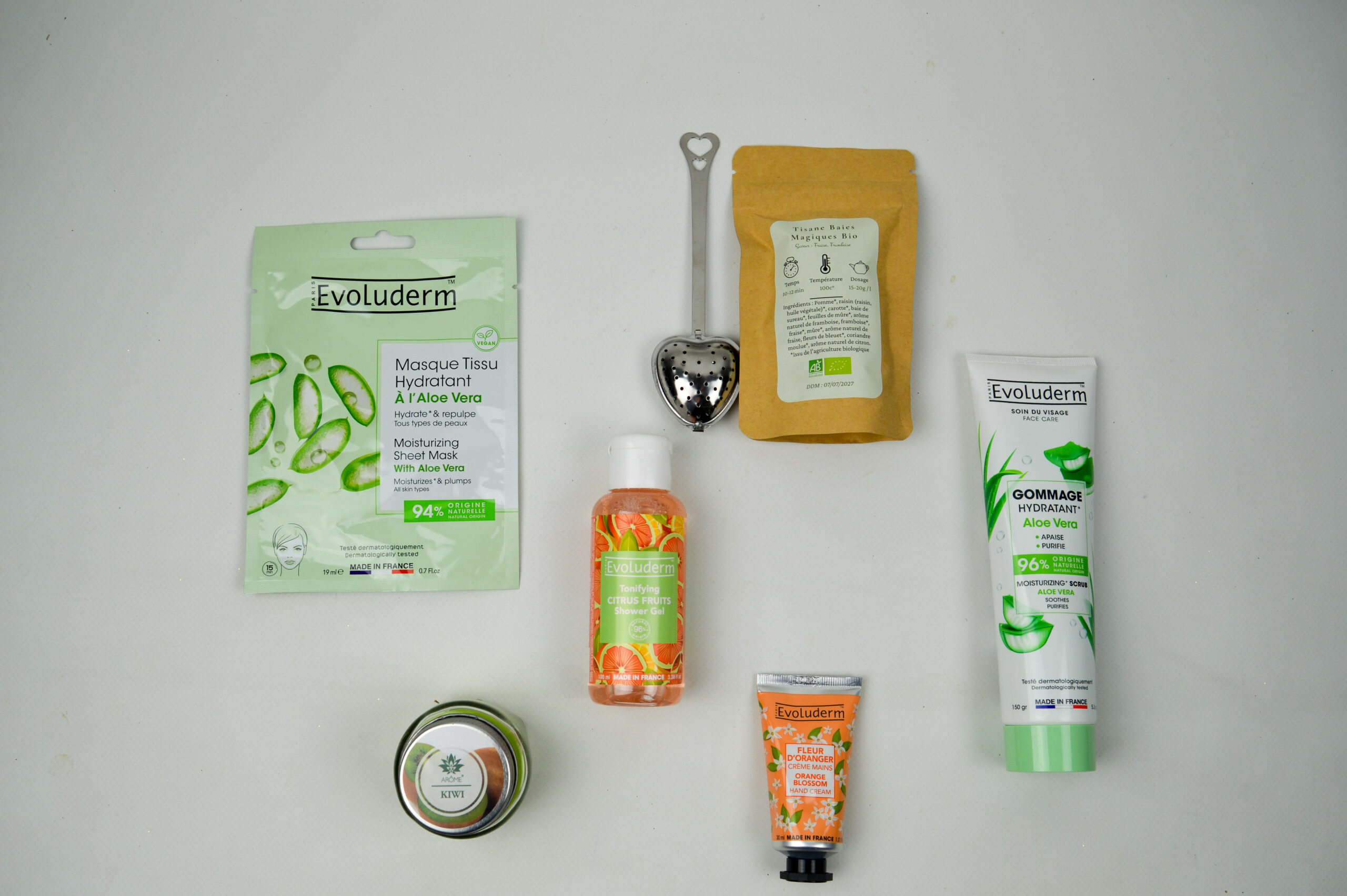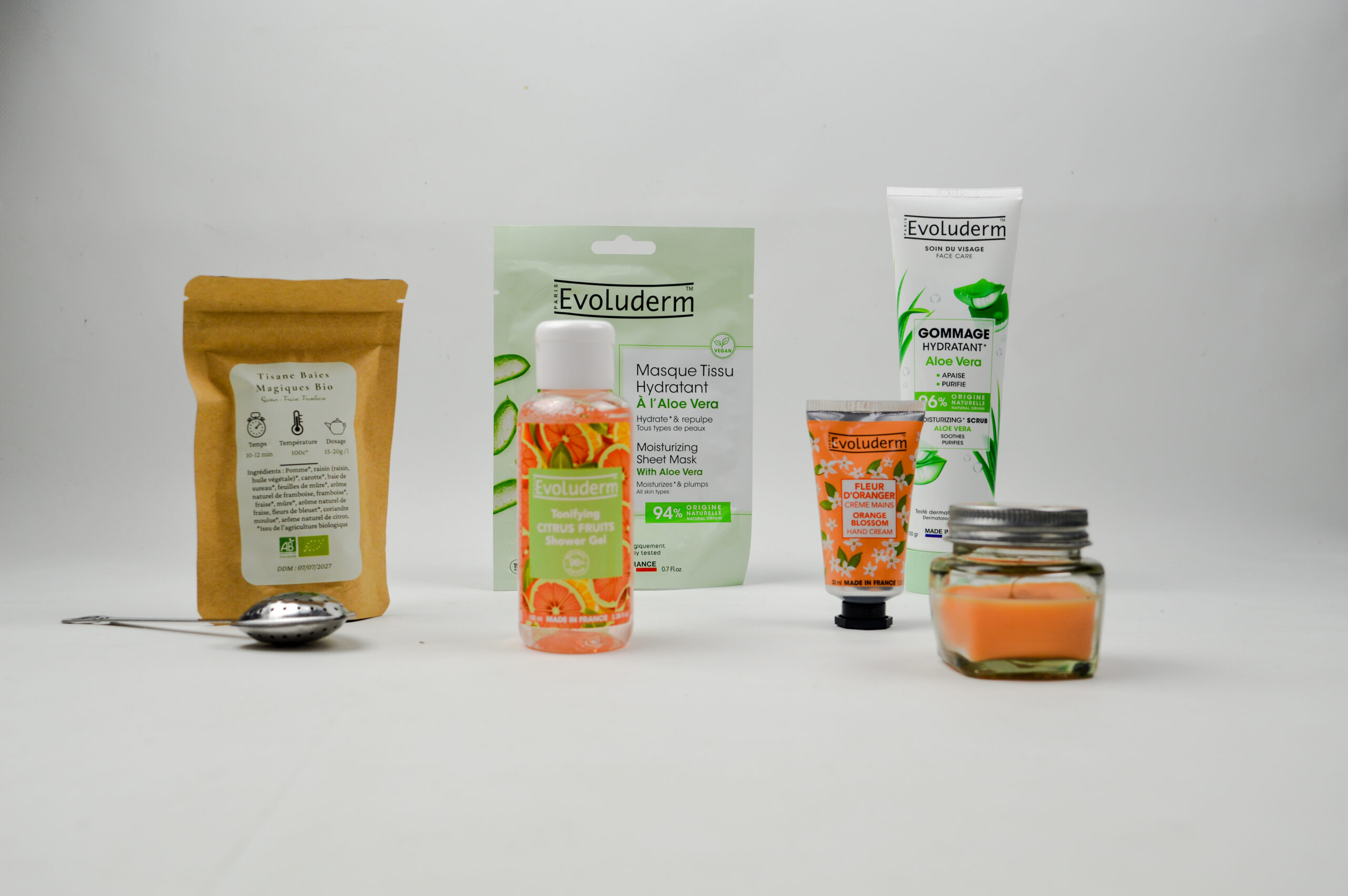 À l’intérieur : une bougie pour créer une ambiance apaisante (La senteur de la bougie varie selon les disponibilités) Laissez-vous surprendre! Un thé délicat à la saveur fraise, framboise avec sa boule à thé pour savourer la pause. Les soins Evoluderm: un gommage visage à l’aloé vera pour nettoyer votre peau en douceur, suivi d’un masque visage également à l’aloé vera, un gel douche ou la senteur varie selon les stocks et une crème pour les mains senteur fleur d’oranger pour chouchouter votre peau et vos sens.